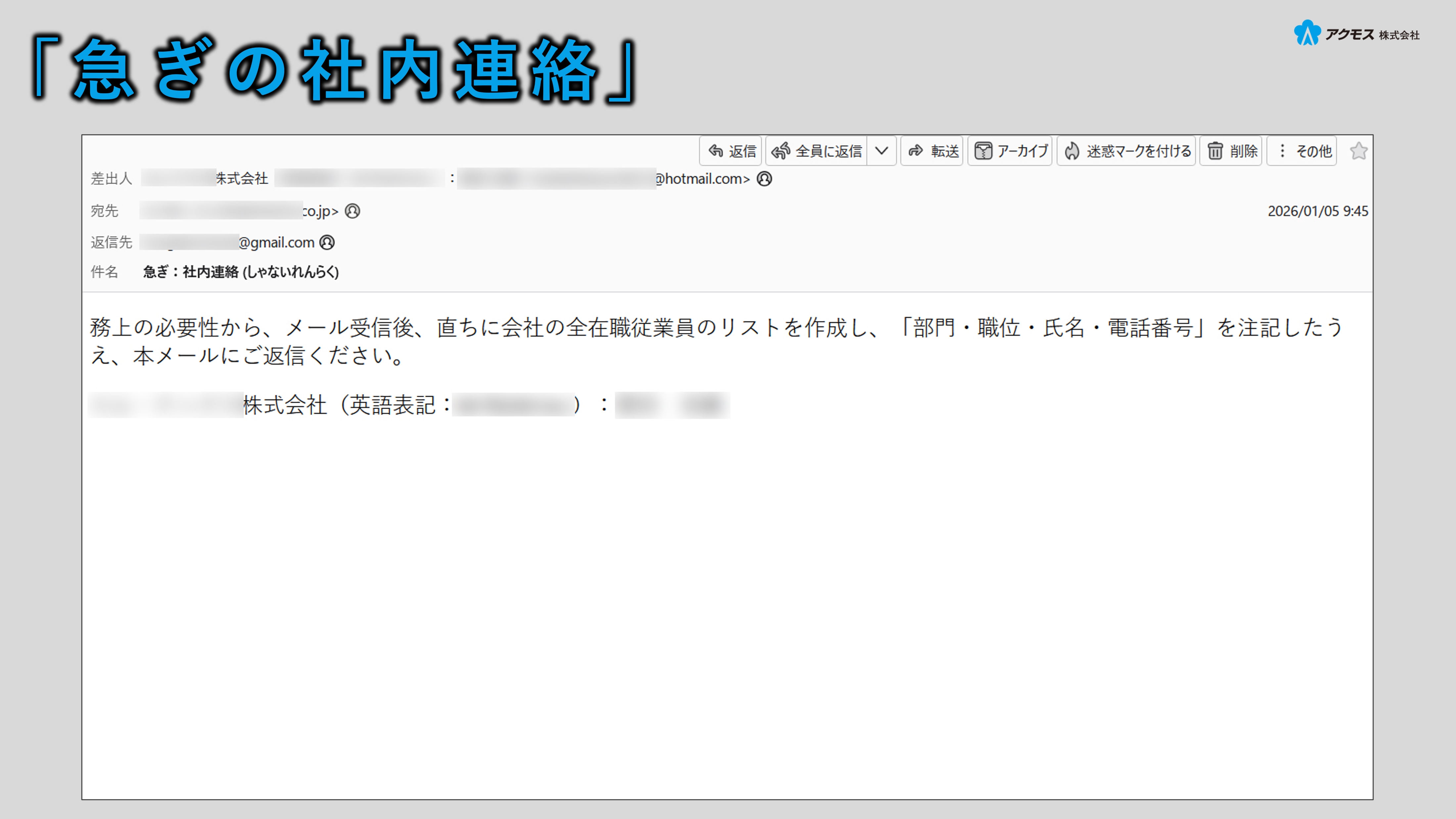 これは、「緊急の社内連絡」を装い、従業員リストの送付を求める偽のメールです。