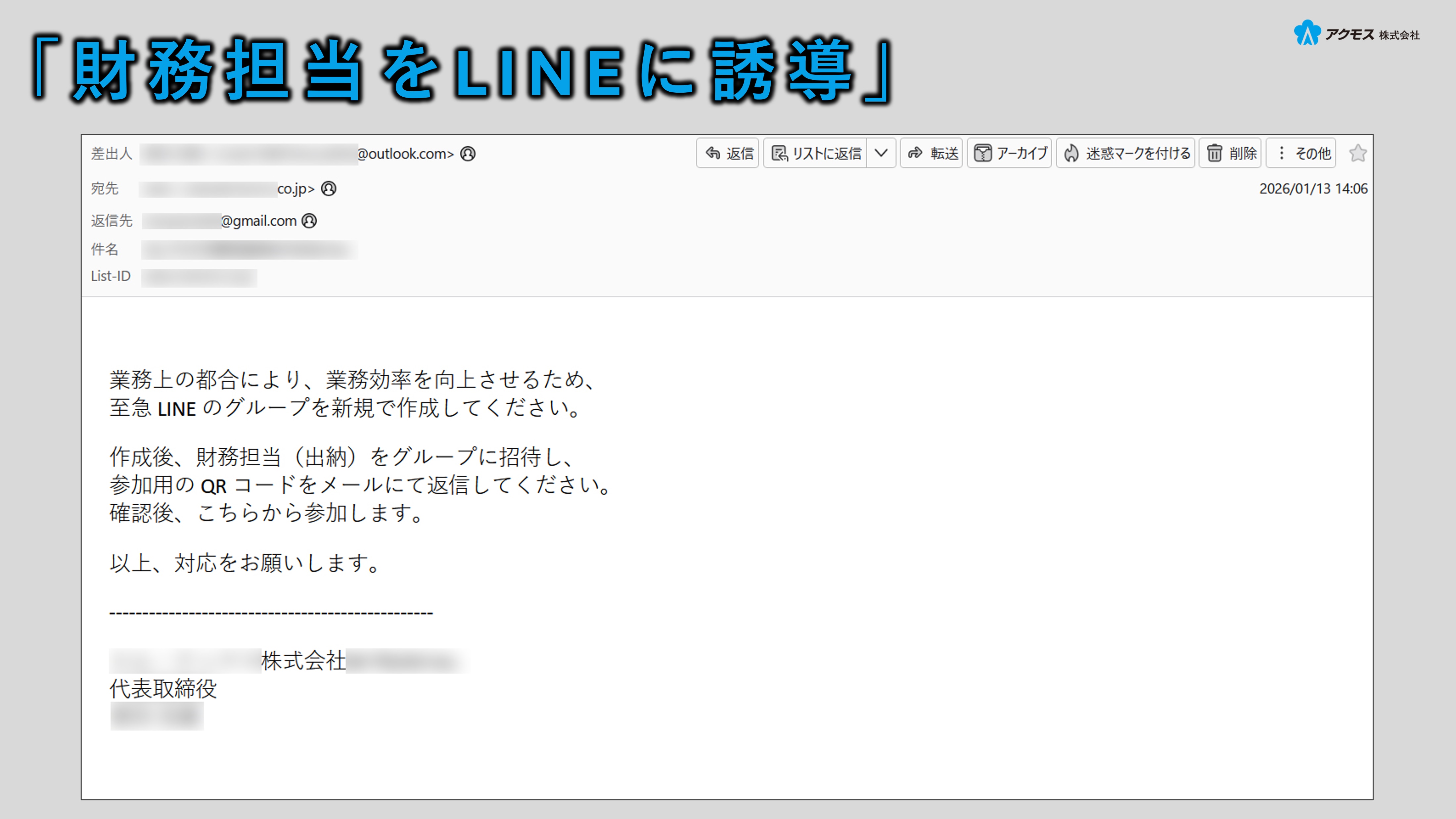 LINEグループを作成し、そこに経理・財務担当者を招待するよう指示しています。これは、LINEに誘導した後、業務命令を装って送金などを指示することを狙ったものと考えられます。