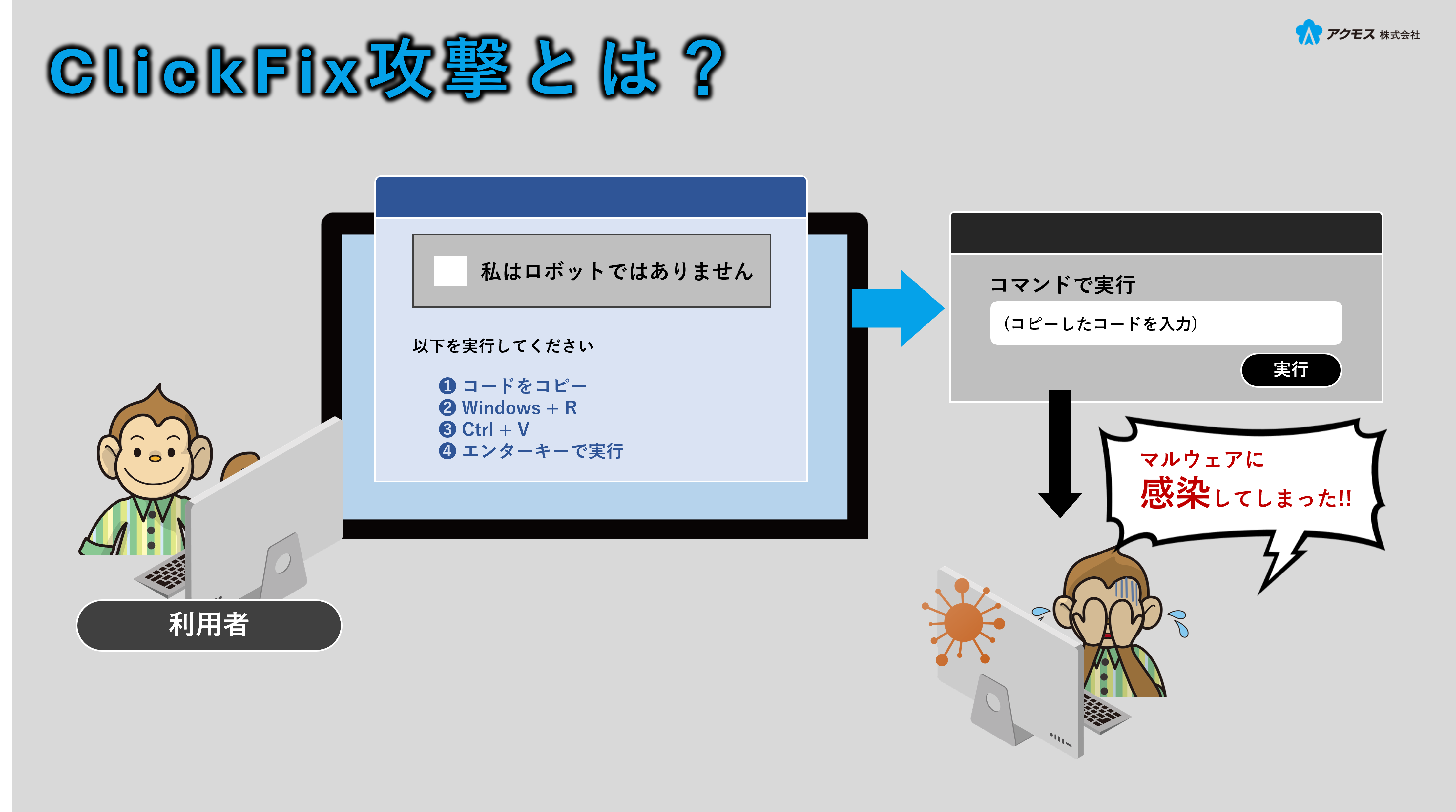 「ClickFix」は言葉通り「クリックや簡単な操作で直すように見せかける」手口を指しますが、実態は複数の段階で進行することが多いです。